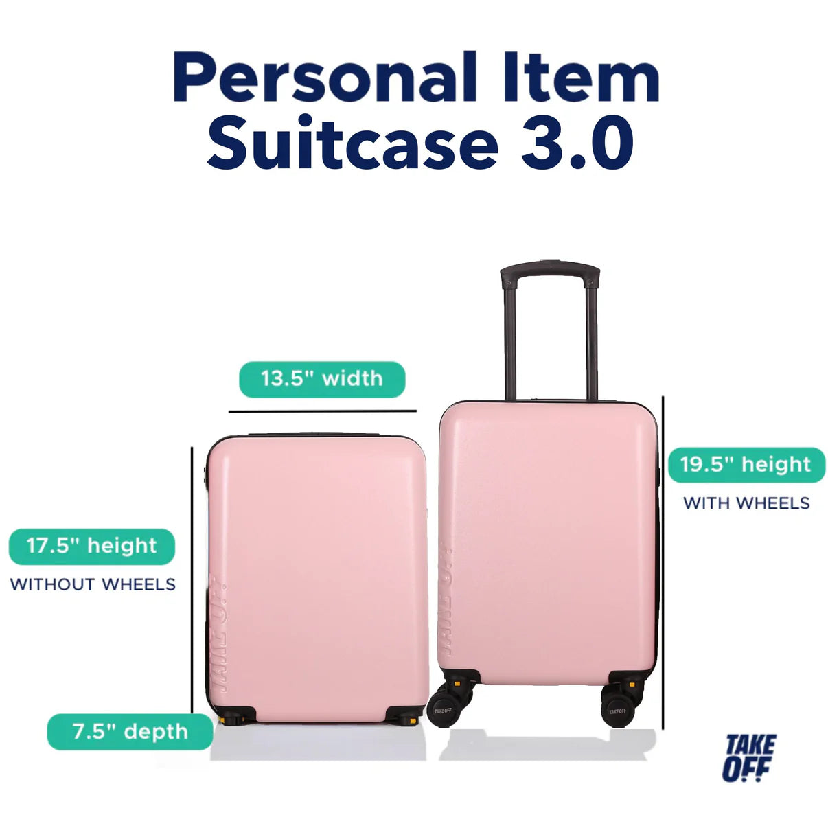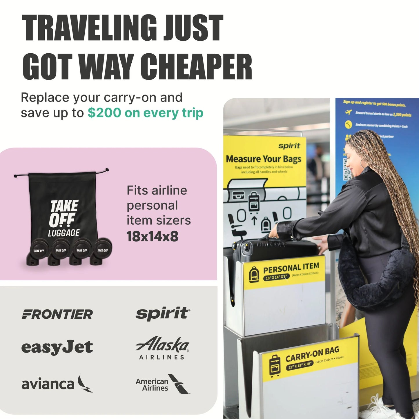 New and improved TAKE OFF Personal Item 3.0 still easily fits inside airline personal item sizers measuring 18ā€ H x 14ā€ W x 8ā€ D (with wheels off), turning your bag from a paid carry-on into a FREE personal item. Save up to $200 on every trip!