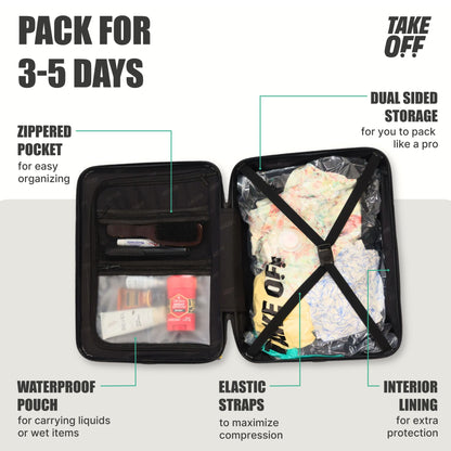 The Personal Item 2.0 XL can fit 3-5 days of clothing. We recommend rolling your clothes or using our Vacuum Seal Bags and Mini Pump to increase packing potential, and wearing bulky or heavy items to 3-5 days of clothing can fit if packed right. Which typically means where your heavier clothes, and pack light fitting clothes inside suitcase.